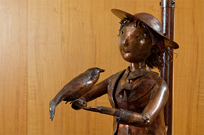 1974 年より立川市高松町の米軍ハウスに「BONZE 工房」を構え、銅板人形の創作を続ける作者。その作品は立川市内をはじめ全国各地に設置されている。展示している《南の風が吹く頃》は、立川駅南口駅前広場に設置された同題のモニュメントの類作。ツバメの話を聞いてまだ見ぬ異国に思いをはせる少女の像は、心を持った銅像の王子と渡り鳥のツバメの交流を描いた童話『幸福な王子』から着想したという。