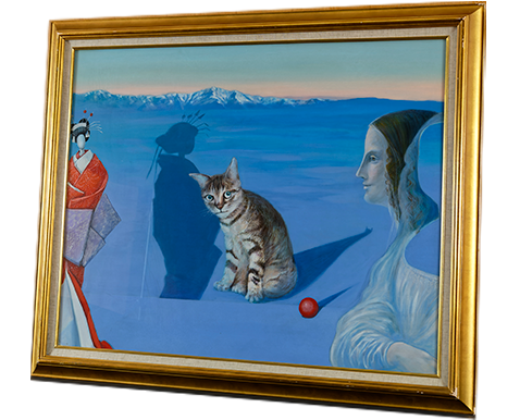 作者は、自由美術展、日本アンデパンダン展、平和展など様々なグループ展に参加しながら、自己の美の表出を探り続けた。シュルレアリスムの影響が色濃い《猫のいる風景》から、自由な反復と規律性が併存する《1990.No.6 水平に》への変化を見ればわかるように、次第に具象から抽象へと画風を大胆に転換していった。「垂直水平などは地球の上での事と気がつく。宙ではこの星のスケールは役にたたない、だろう。さすれば中心周縁も埒の外」と作者は語っている(『鷲見哲彦展』図録、かわさき IBM 市民文化ギャラリー、1990 年)。