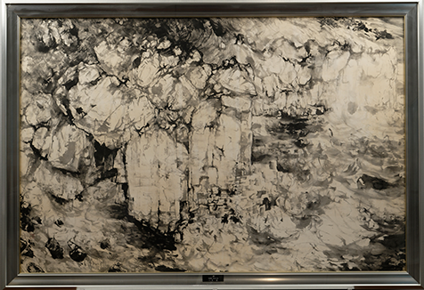 10 代から父に油彩の手ほどきを受けた後、新潟大学芸術学部で洋画を学んだ作者は、20 歳ですでに二紀展への出品を果たした。しかし、40 歳を手前にした時、葦を筆として用いる葦ペンと出会い、以後油彩を捨て、葦で絵を描き続ける。太く育った葦は、墨をふくませて紙の上を走らせると、予期せぬ線を生み出すという。自分の腕と筆は一体でありながら、己の意志によらない描線が画面に現れるからこそ、作者は無心になれると語る。小手先の技巧に陥ることなく、気分の大きな自然風景を描き出す点も大きな魅力である。