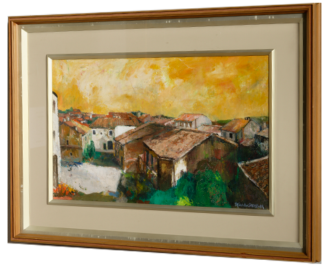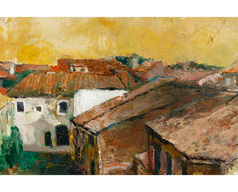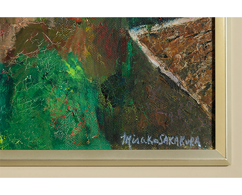 武蔵野美術学校(現・武蔵野美術大学)を卒業した後、創元会会員に推挙された作者は、1967 ~ 1968 年および 1977 年、1982 ~ 1985 年と、幾度も渡欧しており、1977 年にはパリの歴史あるサロン・ドートンヌで入選を果たした。その入選と同じ年に描いた《緑蔭の花売り》 は、パリの街角の花屋を舞台に、陽光にあたり一層鮮やかに輝く色とりどりの花が描かれ、作者が現地で抱いた好奇心や華やぐ気持ちがそのまま伝わってくるかのようである。
